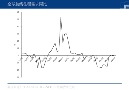 著名航运咨询机构Sea-Intelligence 以箱量*间隔(TEU*Mile)为单位做出了往程航线的需求同比曲线——这样既能够看到全球进口需求的变化也能够看出整体供给链的慌张水平——显现出21年呈现的历史级别高景气行情以及供给链接受着很大的压力,22年需求开端逐步削弱、供给链的压力也得到很大的缓解。进入23年后需求也从22年下半年的低迷中渐渐恢复,连续三个月的同比数字为正值,显现全球的贸易量正在逐渐恢复生力,供给链也没有接受过大的压力。